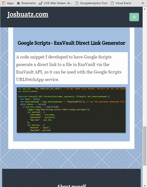 - Code that handles creating events for both versions of the Google Analytics JS library and sending them to ALL attached accounts - this took me a while to make, and ended up being a project on its own. I'll post about it soon and the reusable JS you can use to easily trigger Google Analytics events on button clicks, hovers, and other event listeners.